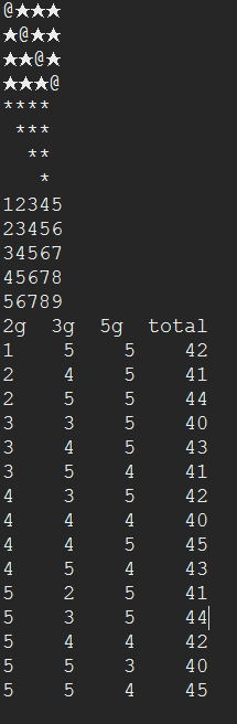 // 2g, 3g, 5g짜리 추가 각각 5개씩 있을 떄 세 가지의 추의 조합으로 무게가 40~45g 사이일 때 각 추의 갯수와 무게를 출력하는 프로그램