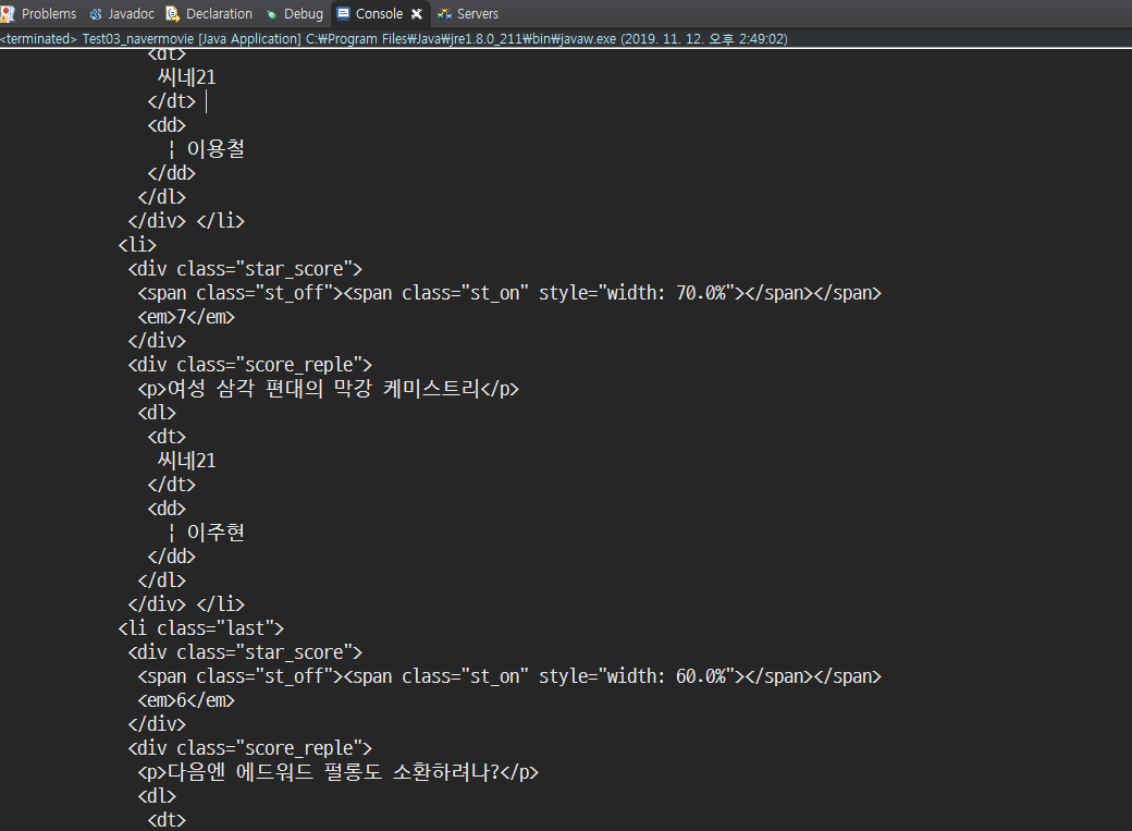 Elements elements=doc.select(".score_reple p"); //p태그로 시작하기 때문에 스페이스바 + p