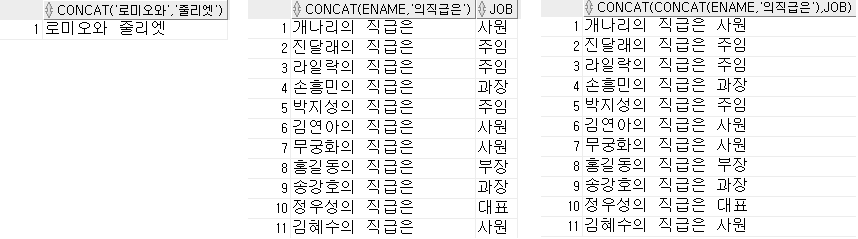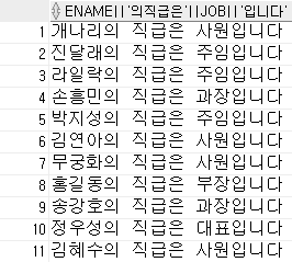 select ename || '의 직급은 ' || job || '입니다' from emp;