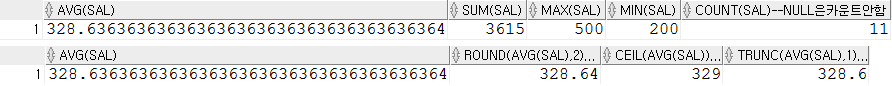 문) 급여평균, 급여합계, 최고급여, 최저급여, 개수 select avg(sal), sum(sal), max(sal), min(sal), count(sal) from emp; - null값은 count 되지 않음 select avg(sal), round(avg(sal),2), ceil(avg(sal)), trunc(avg(sal),1) from emp; |