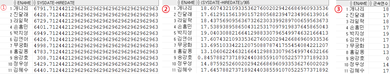 ② 근속연수를 구해야하기 때문에 일한 날 수/365 select ename, (sysdate-hiredate)/365 from emp;