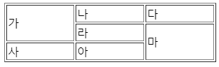 <td rowspan="2">가</td> <!-- 세로 2줄 합치기, 때문에 두 번째 <tr>의 <td>를 지워 줄의 개수를 줄여야함 -->