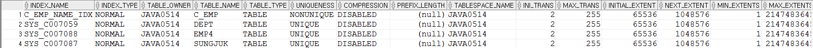select index_name, table_name, uniqueness from user_indexes where table_name in('EMP3', 'EMP4'); |