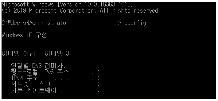 - ipconfig 입력하여 'IPv4 주소' 가 내부IP주소에 해당됨