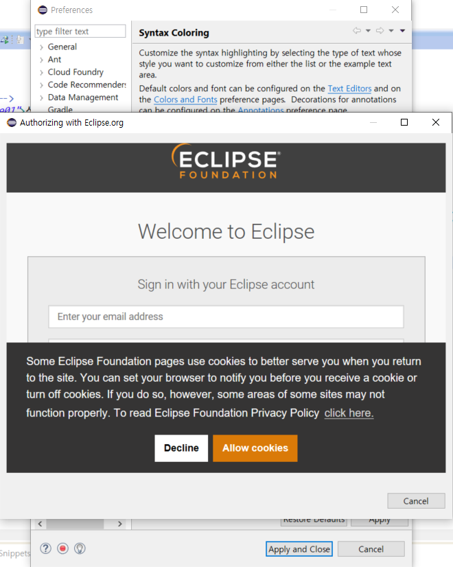 - Window > Preferances 를 들어갔다 나오거나 들어가면 아래와 같은 'Authorizing with Eclipse.org' 팝업창 발생