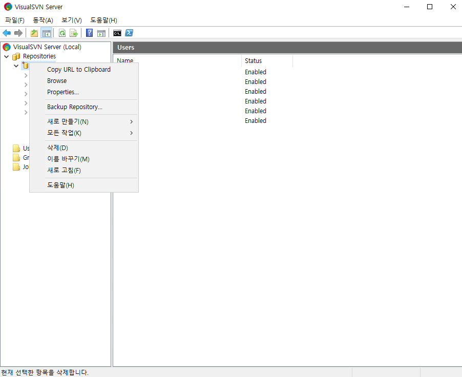 1. VisualSVN Server 실행 > Users > 우클릭 실행 시, Create New User 팝업 발생