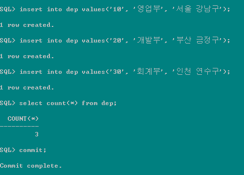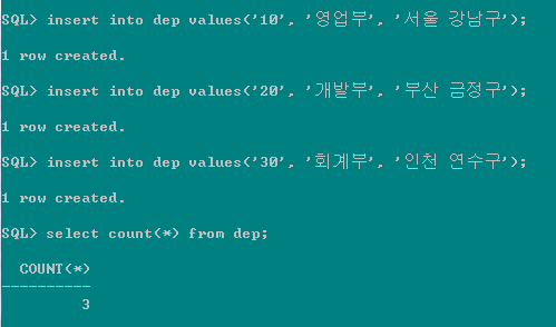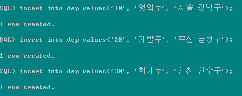 > insert into dep values ('10', '영업부', '서울 강남구'); |