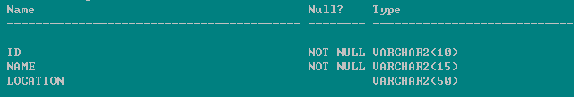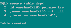 | create table dep( id varchar2(10) primary key ,name varchar2(15) not null ,location varchar2(50)); |