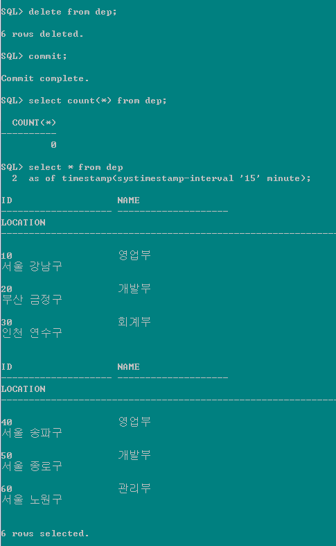 delete from dep; -- 삭제 commit; -- 커밋 insert into dep select * from dep as of timestamp(systimestamp-interval '15' minute); -- 15분안에 데이터 다시 입력 |