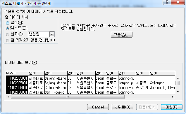 - 맞는 구분 기호 선택시 '데이터 미리보기' 에서 자료가 분리된 것을 확인 할 수 있음