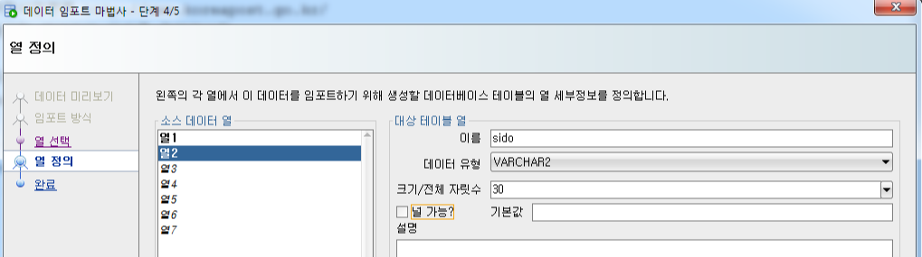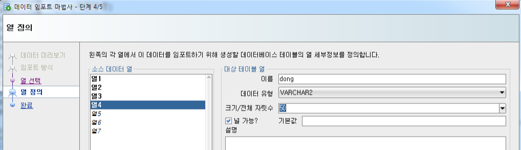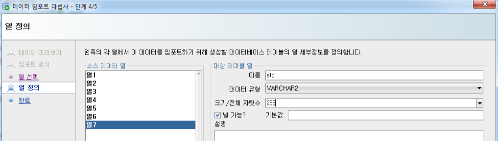 - 널 가능? : 체크 시, null / 체크 해제시, not null