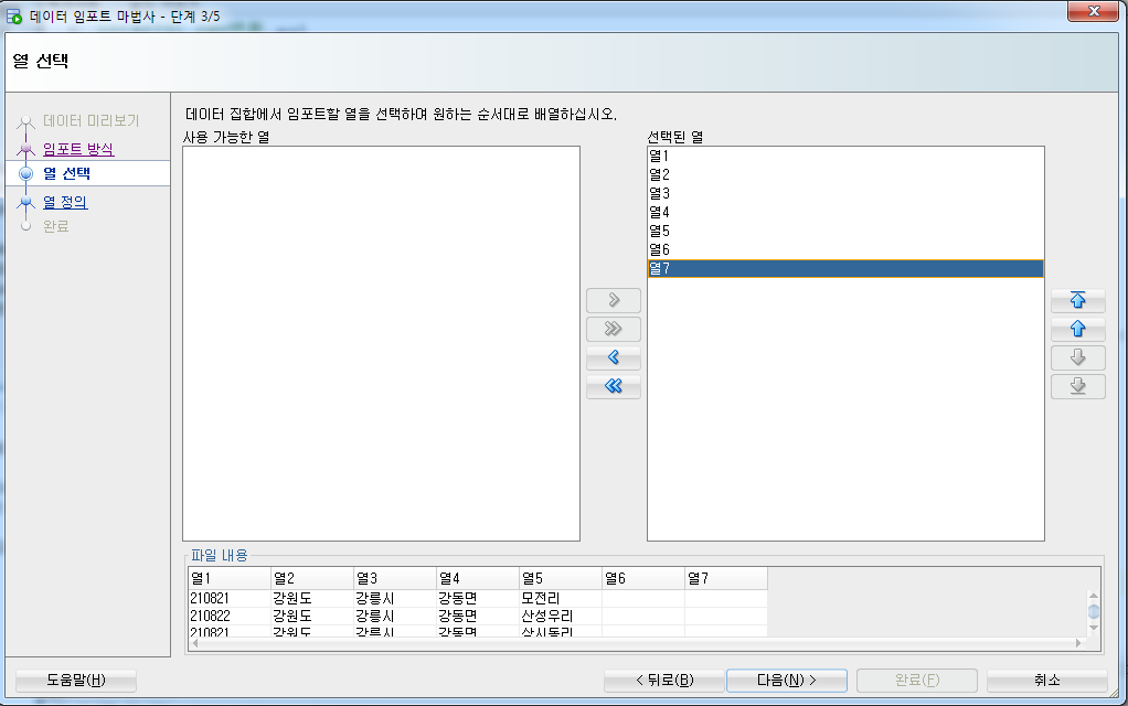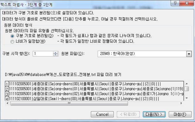 - 이 파일의 경우, 데이터의 구분 기호가 ' | ' 였기 때문에 '기타' → ' | ' 선택