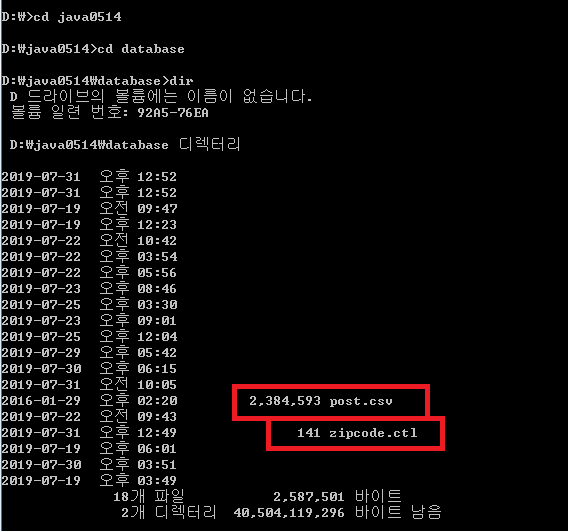 ⊙ cmd에서 dir을 이용해 zicode.ctl 이 있는지 확인 (+ post.csv도 있는지 확인)