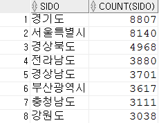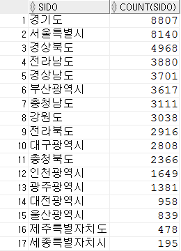 select sido, count(sido) from zipcode group by sido order by count(sido); |