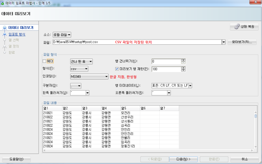 ⊙ 우편번호 post.csv를 등록