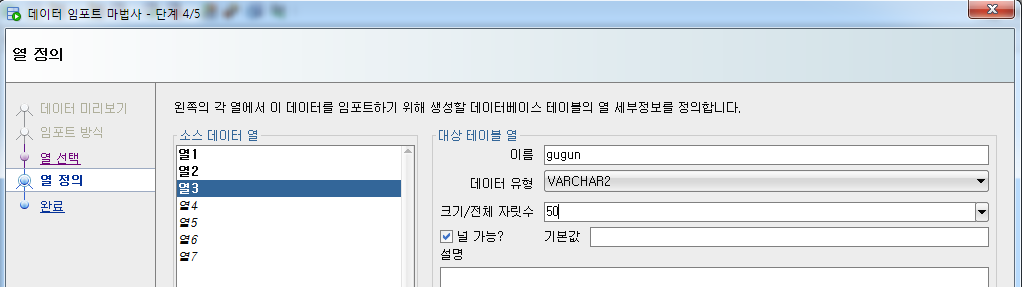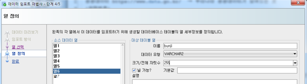 - 열에 맞는 칼럼명, 데이터 유형, 제약조건을 설정함
