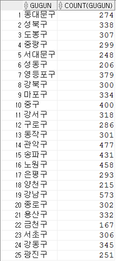 select gugun, count(gugun) from zipcode where gugun="서울특별시" group by gugun; |