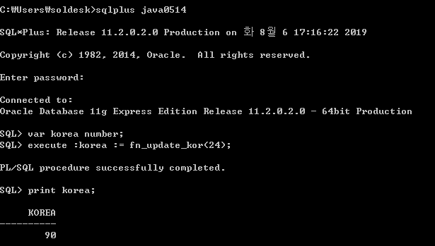 SQL> execute :korea := fn_update_kor(24); --sno가 24인 것에 실행