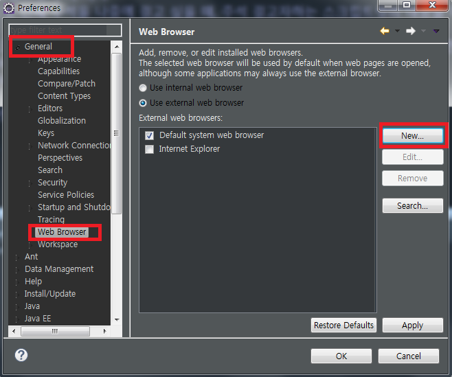 1) 'Window - Preferences - General - Web Browser - New'