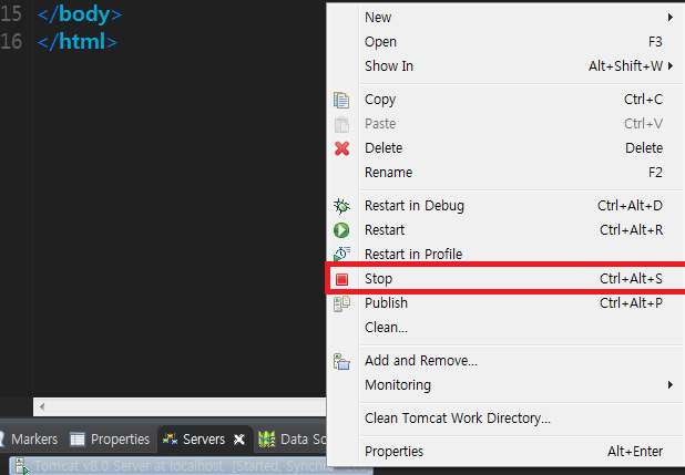 ⊙ 이 설정을 마친 경우, 서버를 멈췄다가 재실행 ('서버 우클릭' - 'stop' - 후 'start')