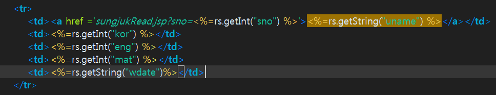 <td><a href ='sungjukRead.jsp?sno=<%=rs.getInt("sno") %>'><%=rs.getString("uname") %></a></td> <!-- ?를 넣으면서 url에 다 나타나는 get방식으로 다 나타남. '이름'에 링크를 걸어서 '상세보기' 페이지를 만들 것, 이렇게 되면 이름에 링크가 발생함 -->
