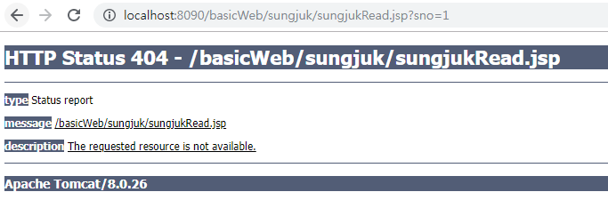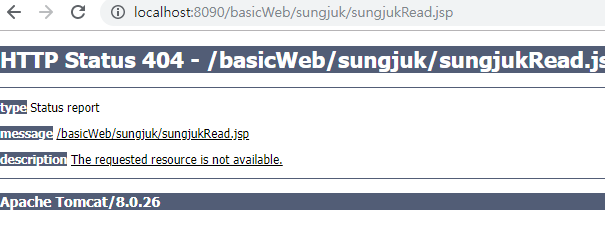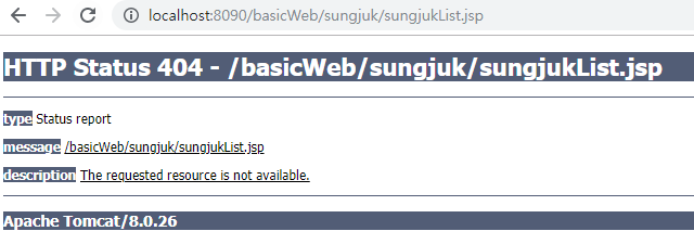 ⊙ 아직은 5) SQL문 실행 때 연결한 'out.println(" location.href='sungjukList.jsp';"); ' 가 존재 하지 않기 때문에 sungjukList.jsp 가 만들어지면 됨