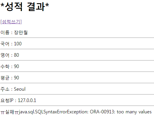 ⊙ sungjukIns.jsp에서 3) 번을 작성할 때 성적칼럼을 mat 까지 밖에 쓰지 않아서 뒤에 더 나와야하는 'aver, addr, wdate' 없어서 값이 많아져서 나는 에러