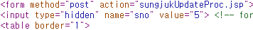 ⊙ form 안에서 sungjuk.sql의 행추가의 sno가 존재하지 않지만 필요한 값이기 때문에 가져오기 위해서 hidden 사용