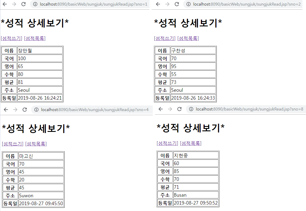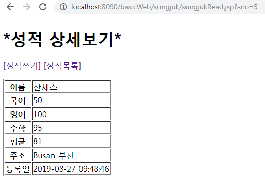 ⊙ sungjukRead.jsp를 통해서 연결을 해주고 난 후에 각자의 이름에 걸린 링크를 누르면 url에 sno 순서가 뜨면서 각자의 상세보기가 나옴