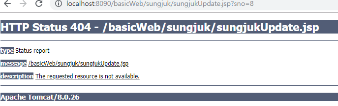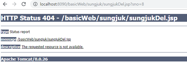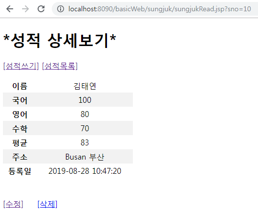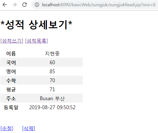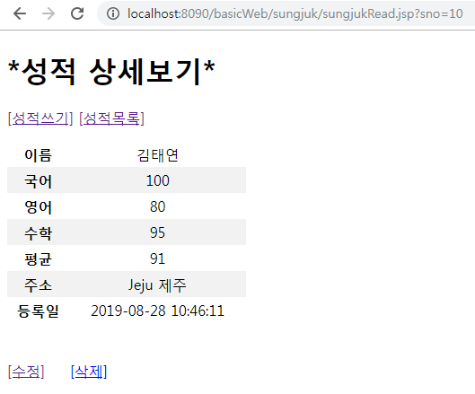 ⊙ [수정], [삭제]는 아직 sungjukUpdate.jsp와 sungjukDel.jsp 가 없기 때문에 클릭시 에러 발생함