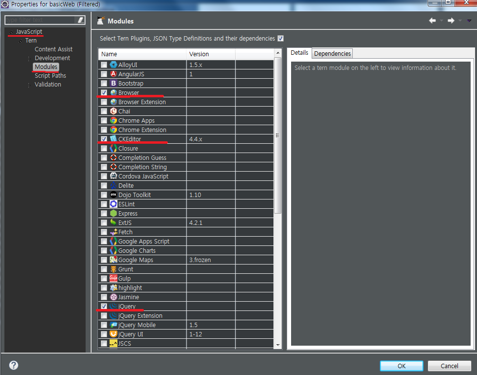 8) 프로젝트 Properties → JavaScript → Tern → Modules → Browser / CKEditor / jQuery 체크