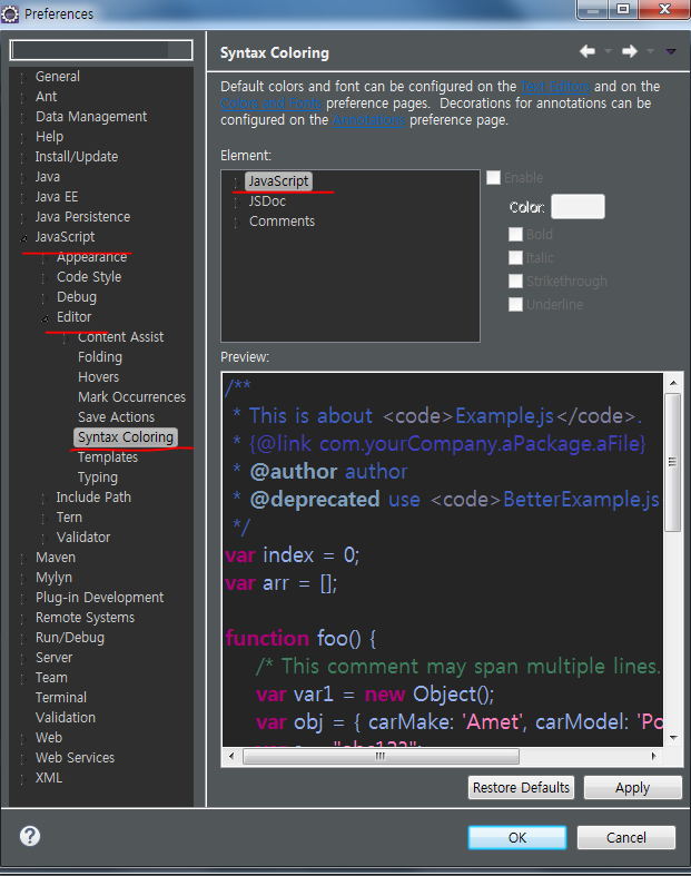 1. Window - Preferences - JavaScript - Editor - Syntax Coloring - JavaScript 에서 색상변경