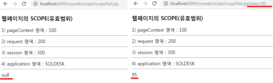 http://localhost:8090/myweb/scope/scopeTest.jsp?aver=95 out.print(request.getParameter("aver")); |